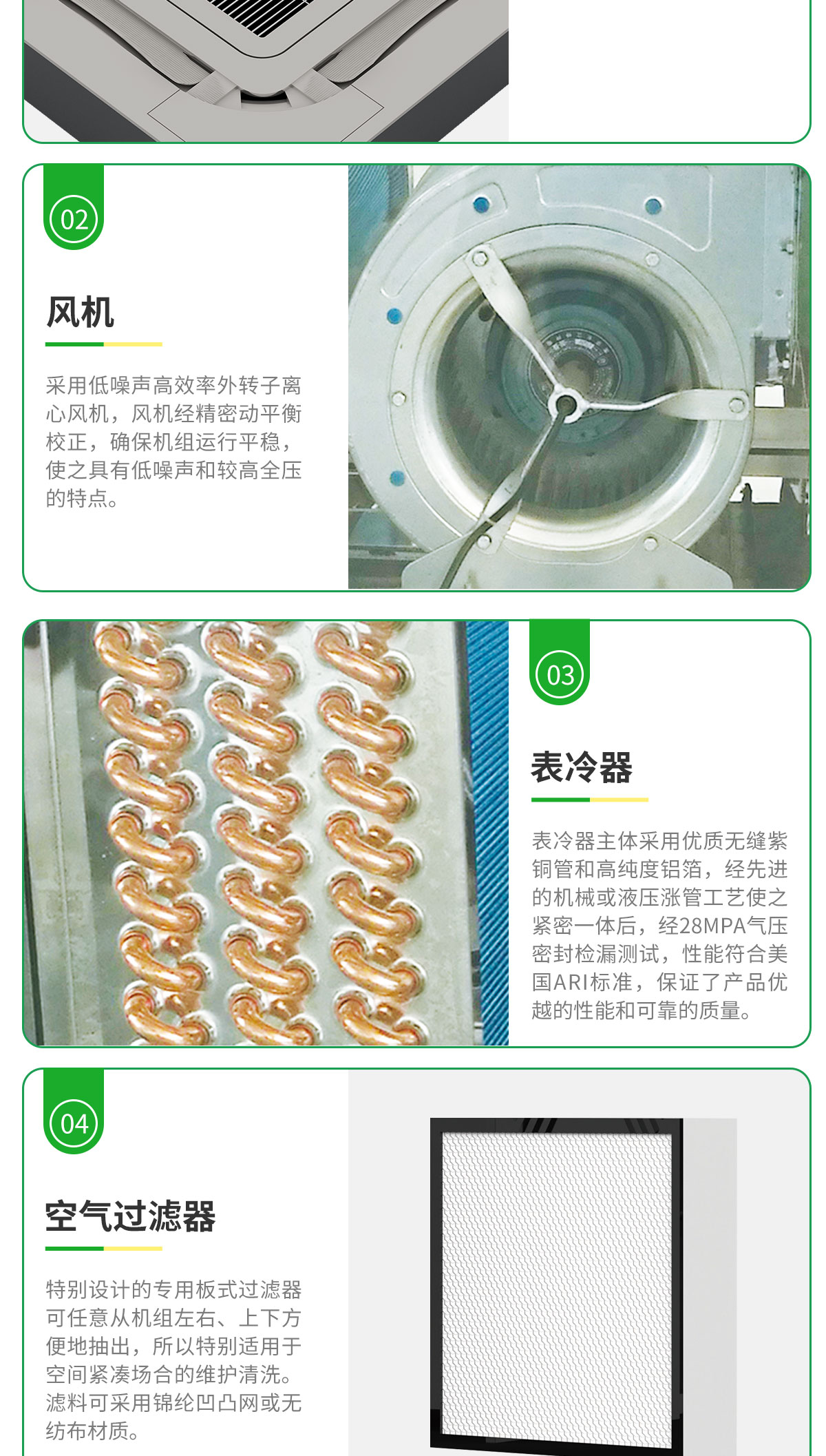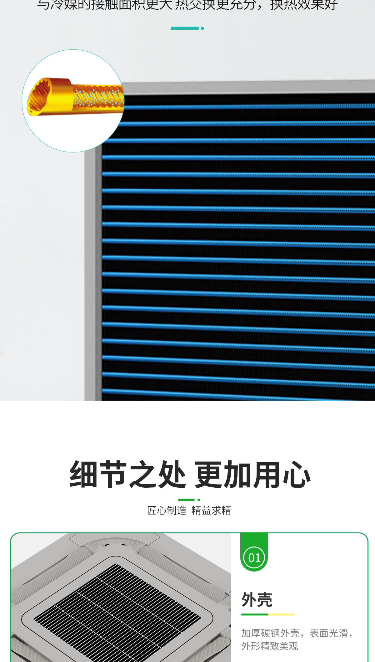 360°廣角送風(fēng),氣流均勻送達(dá)房間各個角落,出風(fēng)柔和,舒適度更高 特有高、中、低3檔風(fēng)速設(shè)計(jì),針對不同安裝高度,可設(shè)定相應(yīng)的送風(fēng)檔,輕松滿足不同安裝高度的送風(fēng)需求 卡式風(fēng)機(jī)盤管預(yù)留新風(fēng)引入接口,可用導(dǎo)管將室外新風(fēng)引入、經(jīng)由全新的長效過濾網(wǎng),令室內(nèi)空氣清新健康更持久