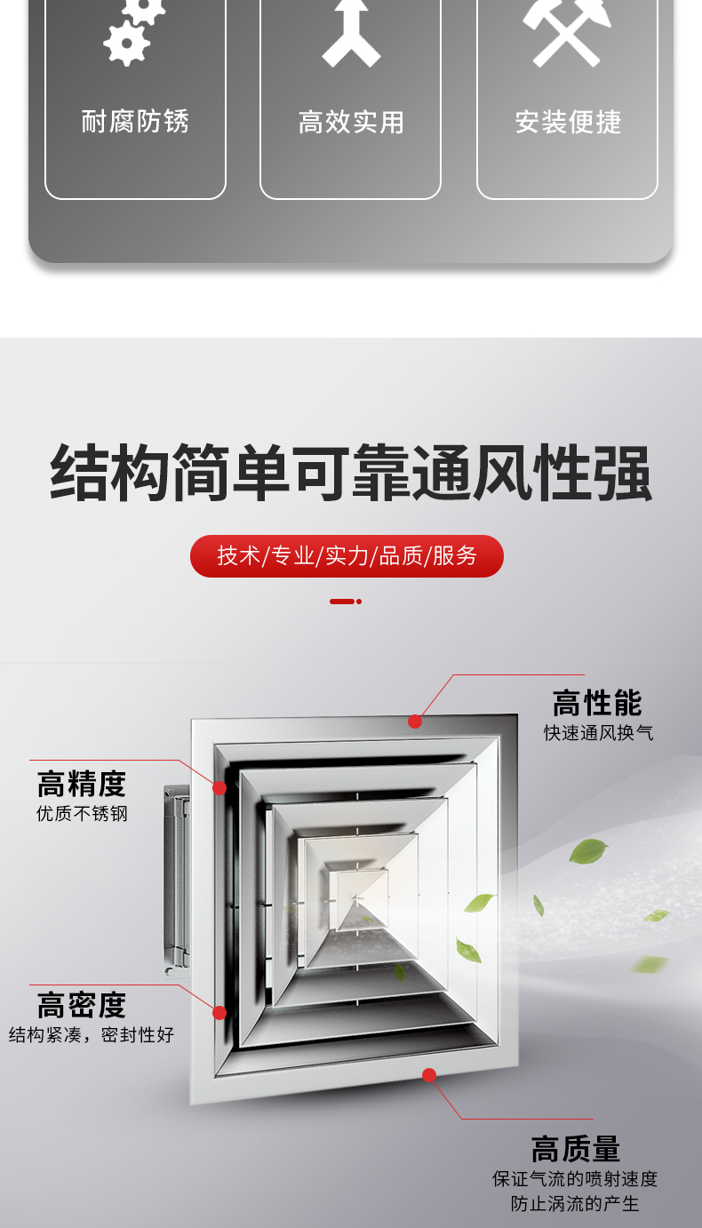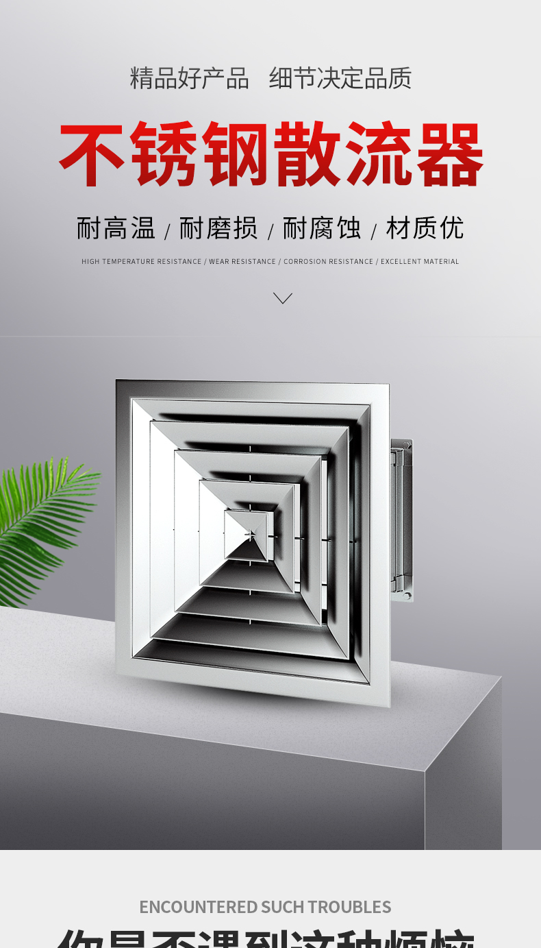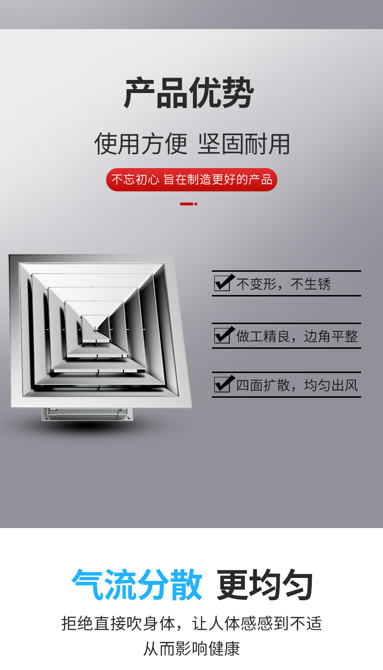 氣流型為貼附(平送型) 適用于吊頂送風(fēng)系統(tǒng) 按性能確定頸部的風(fēng)速,還需考慮安裝的高度及場(chǎng)合 中間葉片蕊可拆卸,便于安裝調(diào)試 尺寸由用戶選定