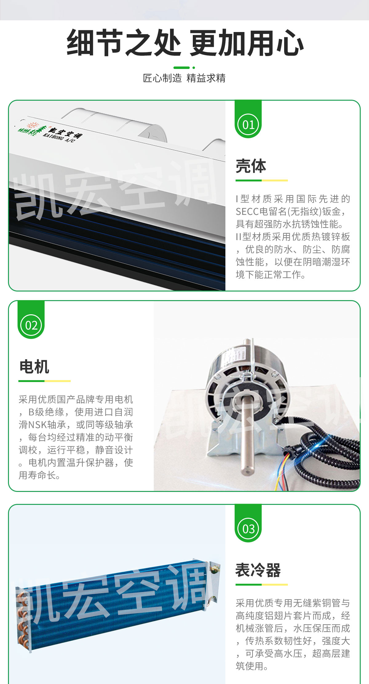 表冷器部件由臺(tái)灣弓|進(jìn)的生產(chǎn)線制造,采用發(fā)卡式大彎管套多曲波紋雙翻邊鋁翅片,集束機(jī)械漲管,傳熱效率高,水阻、風(fēng)阻 機(jī)箱采用寶鋼三期優(yōu)質(zhì)鍍鋅板生產(chǎn)。強(qiáng)度高、耐腐蝕性強(qiáng) 風(fēng)機(jī)部分采用全金屬風(fēng)機(jī)和優(yōu)質(zhì)名牌電動(dòng)機(jī)及進(jìn)口NSK免維護(hù)軸承,具有超低噪聲,保證機(jī)組寧?kù)o、長(zhǎng)久可靠地運(yùn)行 凱宏卡式四出風(fēng)風(fēng)機(jī)盤(pán)管,采用全塑面板,外形美觀大方,徹底克服表面結(jié)露現(xiàn)象